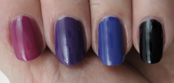 I did not let the fact that Wish Upon a Star has a black base keep me from trying it as a layering polish. For my base colors, I chose Sally Hansen Complete Salon Manicure Cherry Cherry Bang Bang (magenta), Sally Hansen Insta Dri Vivid Violet (purple), Sally Hansen Insta Dri Purple Heart (blue violet), and black (I didn't note which one, probably either Wet 'n' Wild Wild Shine or Funky Fingers).
