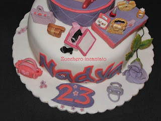 Nadya è una bellissima ragazza che adora la moda, le piace fare shopping e comprare borse e scarpe di ogni tipo. Ho immaginato quindi la protagonista di ritorno da una delle sue incursioni di shopping e l'ho posizionata sopra un puff-divano attorniata dalle numerose borsette che aveva comprato e un bel paio di sandali con il tacco. Naturalmente non potevano mancare gli oggetti che una bella ragazza utilizza ogni giorno!! Perciò su un tavolino ho posizionato la trousse del trucco, il profumo, la boccetta di smalto, e una bella borsetta dorata. Come ultimo tocco non poteva mancare una rosa, fiore che lei adora, abbinata ai suoi colori preferiti! Auguri Nadya!