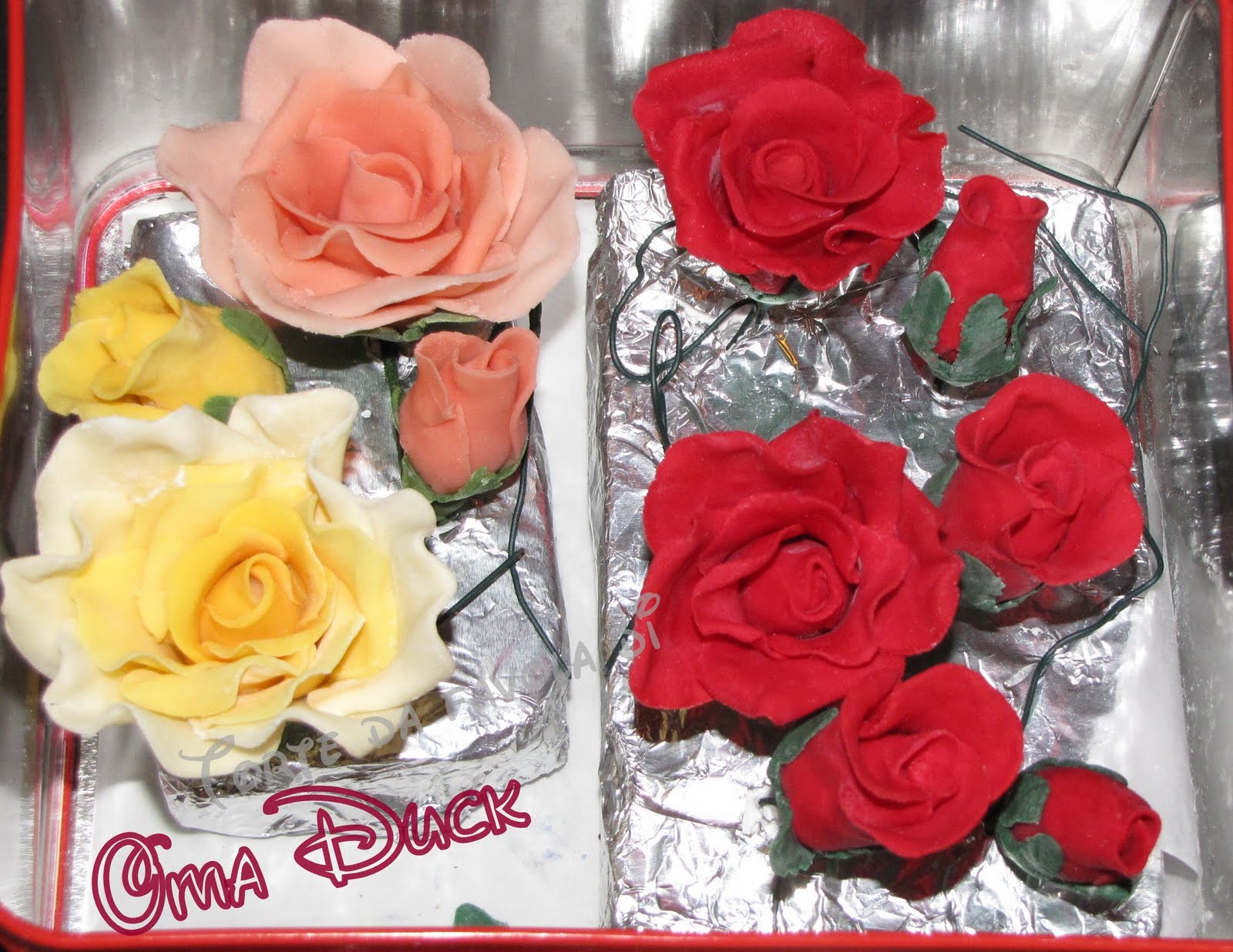 Non fatevi ingannare dal nome, la pasta di gomma è altrettanto commestibile come la pasta di zucchero e il suo ingrediente principale resta pur sempre lo zucchero a velo ma ha una maggiore stabilità e si adatta meglio per fare dei petali sottili che non si sgretolino. Infatti, regge molto meglio nel tempo per cui, con le dovute accortezze, questi fiori si possono conservare davvero a lungo. E perché no? Possono anche far bella mostra di sé in un bel vaso sulla credenza ;-) Devono ancora esser completate naturalmente, devono asciugare per bene e sto preparando le foglie. Vi piacciono?
