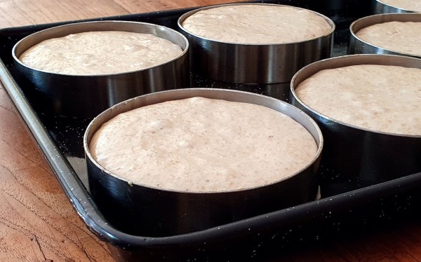 Pour the dough into the crumpet rings, filling them halfway. You may need to “cut” the dough with the edge of your spoon/spatula if it was cold to get it out. If it was room temp it should be more like batter.