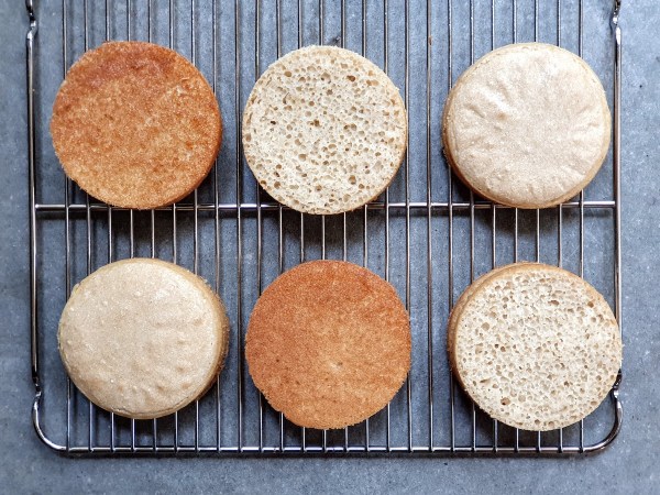 Heat oven to 150C (300F) and bake crumpets for 15 minutes, rotating the tray half way. At 7 mins the tops should be dry – now check the edges aren’t brown (if so your oven is running hot). After 15 mins the bottoms should be lightly golden, but not brown (they will burn when you toast them if you go too dark now). If not your oven might be a bit under temp – note this and bake a few mins longer until lightly golden. Let sit a minute (no longer, or you’ll lose a lot of crispness) before dislodging them from your baking tray with a spatula. Cool on a rack until warm enough to shimmy out of the rings. They might need a bit of coaxing (this is why butter or a solid fat is important for greasing!), but they should come out – push from the top, near the edges.