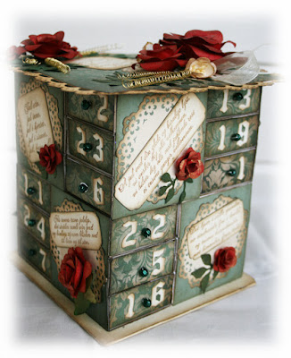 Neste som er litt mer voksen kalender. Her er alle de røde rosen håndlaget, og her shimrer det meste. Brukt Perfect Pearl gold og blandet på mistflaske med vann. Og vips, så hadde jeg