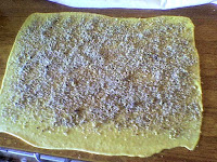 Jedan dio razvaljajte u tanki pravokutnik (kod mene je to bio pravokutnik dimenzija oko 48 cm x 28 cm).