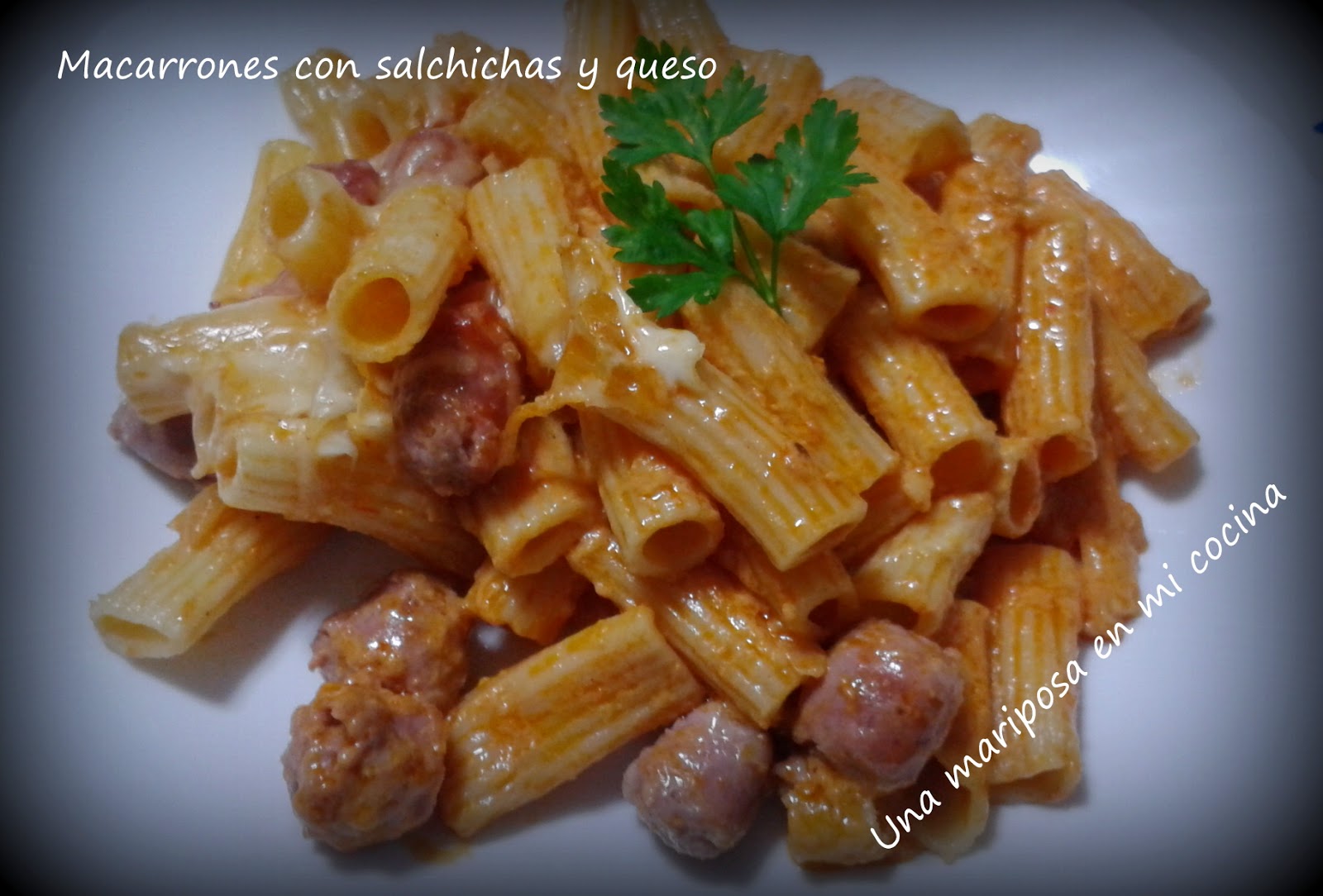 Escurrimos los macorrenes y los volcamos en una fuente que pueda ir al horno, vertemos por encima la salsa con las salchichas, mezclamos un poco y espolvoreamos con el queso rallado.