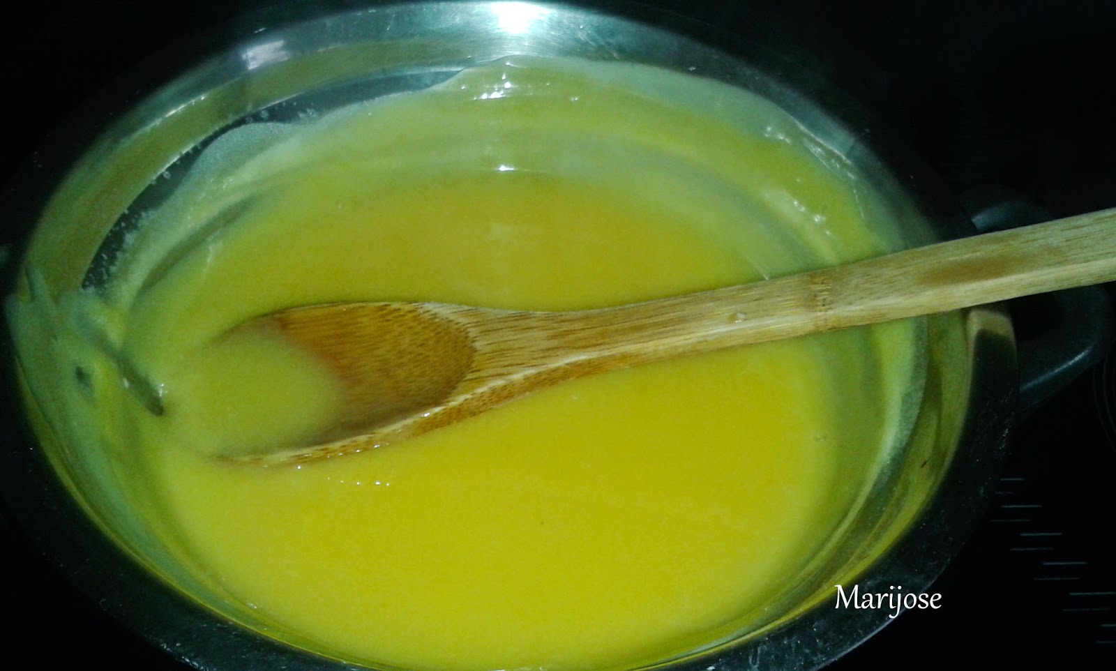 Añadimos el zumo y ponemos el bol al fuego al baño maria removiendo con una cuchara de madera hasta que coja consistencia.