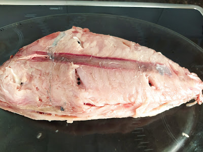 Limpiamos bien el atĂșn, sacamos la piel(esto podemos pedir que nos lo hagan en la pescaderia) y dejamos un buen rato en agua fria para que se desangre.