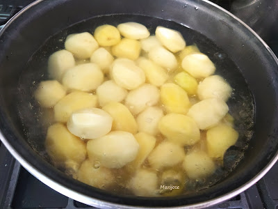 Mientras se hace el pescado preparamos las patatas y para ello pelamos unas patatas pequeñas y redondas del tamaño de una nuez y se ponen a cocer al fuego cubiertas de agua con sal , cuando rompan a hervir dejamos cocer 5 minutos, escurrimos y tiramos el agua