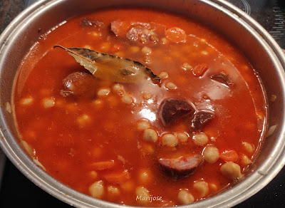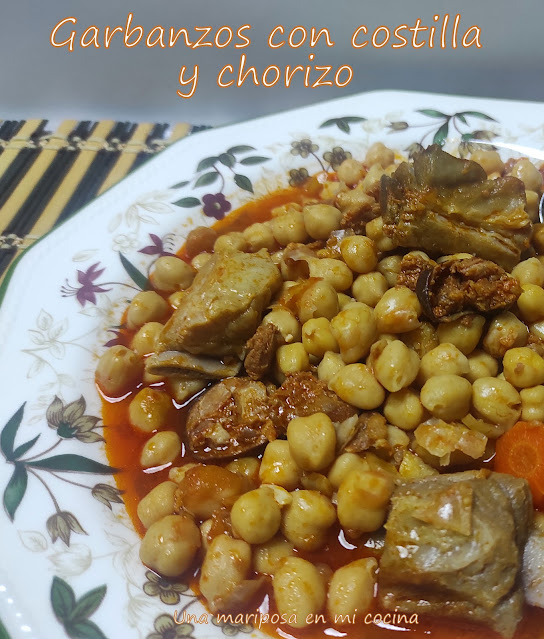 Bueno chicos pues ya ha llegado el frio asi que apetecen los guisos y platos de cuchara, , hoy preparamos un potaje rapidito para comer, podemos tener la costilla cocida del dia anterior y como los garbanzos son de bote, solo es hacer un sofrito y en cuanto se cueza el chorizo ya lo tendremos listo.