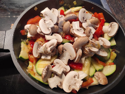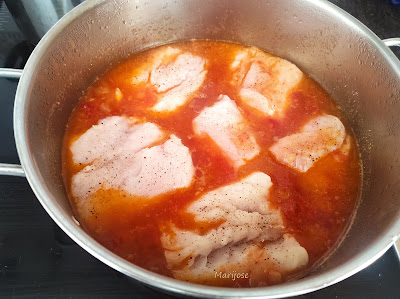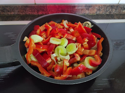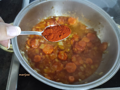 Añadimos la salsa de tomate y salpimentamos y cuando esten las verduras pochadas añadimos 1/2 cucharadita de pimentón dulce