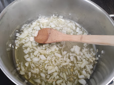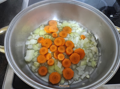 En una cazuela con unas cucharadas de aceite de oliva sofreimos la cebolla , la zanahoria y los ajos picados