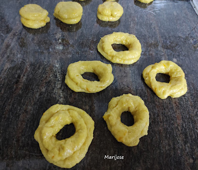 Luego colocamos de dos en dos , hacemos un agujero en el centro con el dedo y formamos las rosquillas