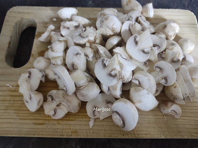 Limpiamos bien los champiñones y cortamos en laminas o trozos