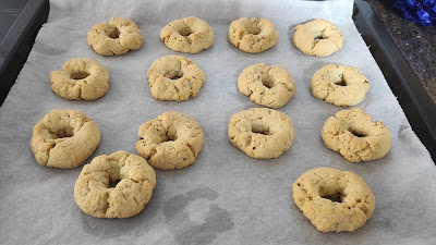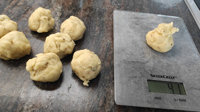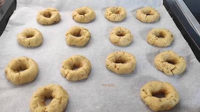 Formamos bolitas pequeñas, de unos 18-20 grs y colocamos en una bandeja sobre papel de horno un poquito separadas entre si