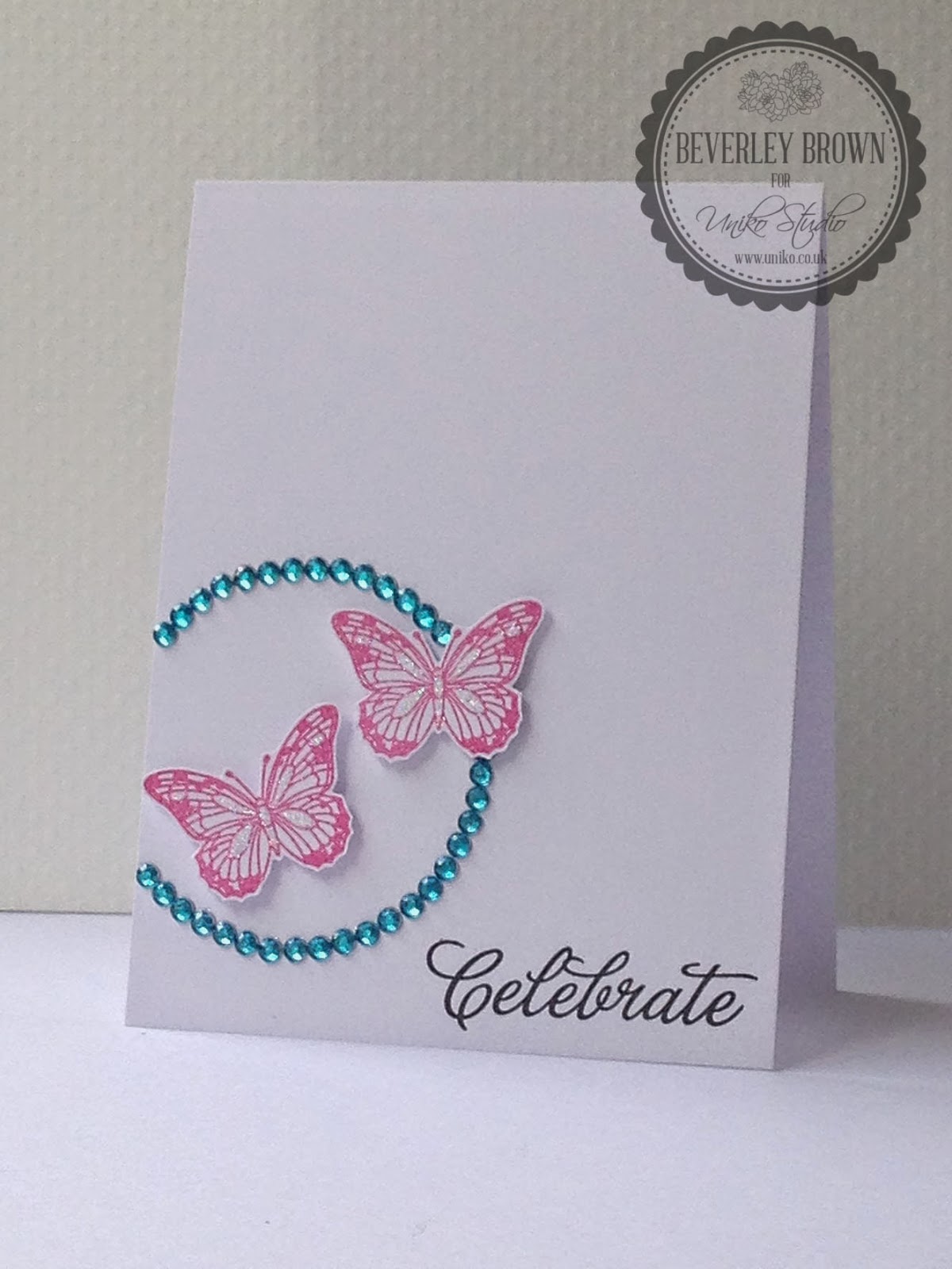 If you stop by here often you will know that I LOVE butterflies, so it may not really be a surprise to you that I had to go with the optional twist! I started out by drawing a circle with a pencil and adding LOTS of rhinestones to create a circle of sparkle. I have a ton of this colour and size of rhinestone in my stash left over from a Wedding Invitation commission I did a few years ago.