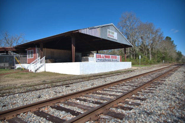 At the encouragement of Brooks County’s first peach grower, I. C. Williams, James E. Moody began growing peaches in the late 1950s. He began packing the fruit in an old cotton gin by the railroad tracks, as a way to streamline his operation and ship his peaches in a timely manner. As his business grew, he built this more modern shed, originally known as the James Moody Peach Shed. It was later known as Joyce & Moody, before becoming Luck & Moody. Mr. Moody’s daughter and granddaughter continue the business today.