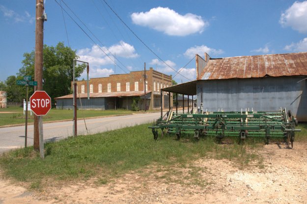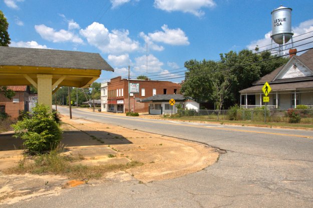 Leslie native “Lindsey” writes: “The bank was the Leslie branch of Sumter Bank* and Trust, and closed in the late 90s (the other branch is still in Americus). My mom worked there for almost 20 years. The middle store was a drug store when I was a child, then an antique store, while the building at the end was the post office, which was the last to close it’s doors just a few years ago.”