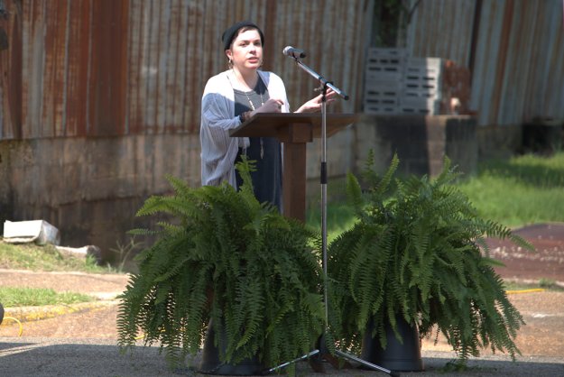 Annie Moye, who organized the event and helped secure the mural, speaks at the dedication.