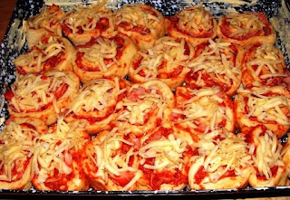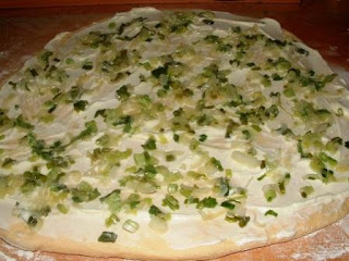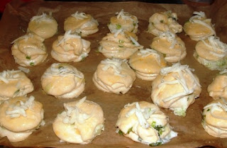 Ha a tészta megkelt, lisztezett deszkára borítjuk, 5 percig pihentetjük, majd kb. 1 cm vastagra kinyújtjuk, megkenjük a vajkrémmel, majd egyenletesen eloszlatjuk rajta a hagymát. Lazán feltekerjük mint egy tekercset, egy kissé ellapogatjuk, majd félbehajtjuk, tiszta konyharuhával letakarva további 20 percig pihentetjük. Ne ijedjünk meg, ha a töltelék itt-ott kifolyna.. Ezután kinyújtjuk kb. 2-3 cm vastagra, pogácsaszaggatóval vagy egy pohárral kiszaggatjuk és sütőpapírral kibélelt vagy margarinnal, zsírral megkent tepsire helyezzük. A maradék tésztadarabkákból kézzel kis pogácsákat formázunk, azokat is a tepsire tesszük. Letakarjuk és további 20 percig pihentetjük. Mialatt a sütőt előmelegítjük 180 fokra, megkenjük a pogácsákat a felvert tojással és megszórjuk a reszelt sajttal. 30-35 perc alatt aranybarnára sütjük.