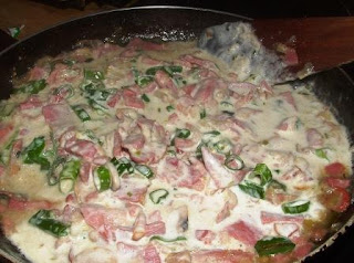 Közben a hagymákat megpucoljuk, vékony karikákra vágjuk és kevés olajon 1-2 percig átforgatjuk.