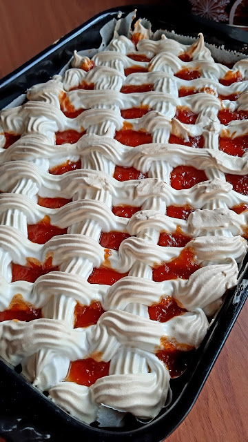 - Miután letelt a 20 perc, kivesszük a sütit a sütőből, pár percig hagyjuk hűlni. A habot egy habzsákba kanalazzuk, majd átlósan csíkokat húzunk a túrókrémre. A közökbe kiskanál segítségével lekvárt kanalazunk. Készíthetjük úgy is, hogy lekenjük az egészet lekvárral és utána húzzuk a fehérjehabot. Ha nincs habzsákunk, egy uzsonnás zacsi is megteszi, aminek a csücskét picit levágjuk. :)