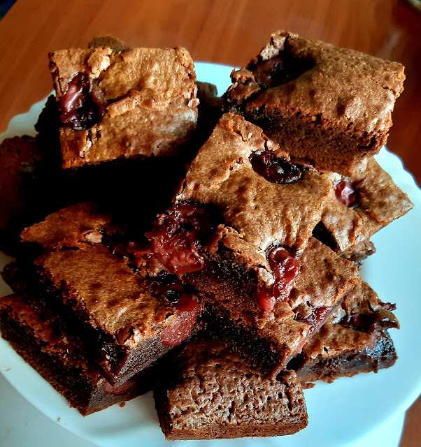 Bíborka egyik nagy kedvence a brownie, most megszórtam egy kis meggyel, szerintem így sokkal finomabb, mint simán... :)