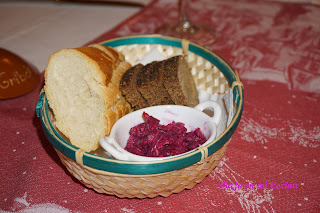 Junto con el pan te traen una pequeña ensalada de remolacha, hay pan blanco y negro.
