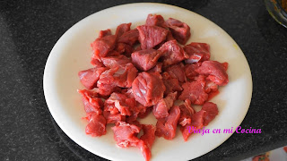 4- Salamos y cortamos la carne en cubitos.