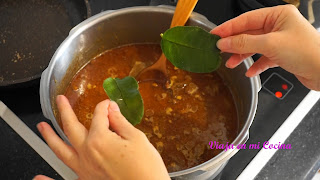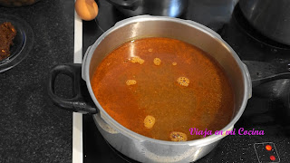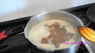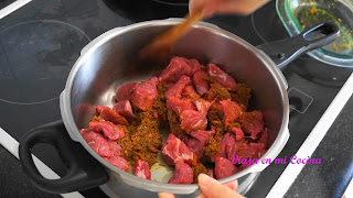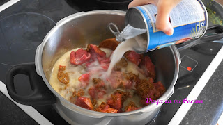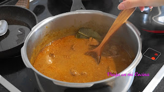 6- Una vez hierva, lo ponemos a bajo fuego y cocinamos durante 70 minutos removiendo de vez en cuando, hasta que la carne esté blanda. Si vemos que se reduce el líquido podemos añadir un poco de agua.