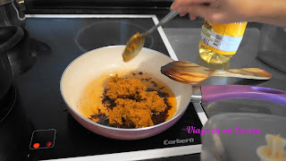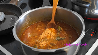 5- En una cazuela mezclamos la carne con la pasta Laksa, también añadimos la leche de coco y removemos bien.
