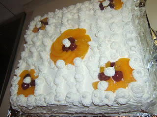 Az oldalát és a tetejét a megmaradt tejszinhabbal diszítettem, s hogy ne legyen az egész hófehérke, és mindenki ízlésének is megfeleljen: őszibarack szeletekkel, s pár szem meggyel szineztem ezt az óriás tortát.