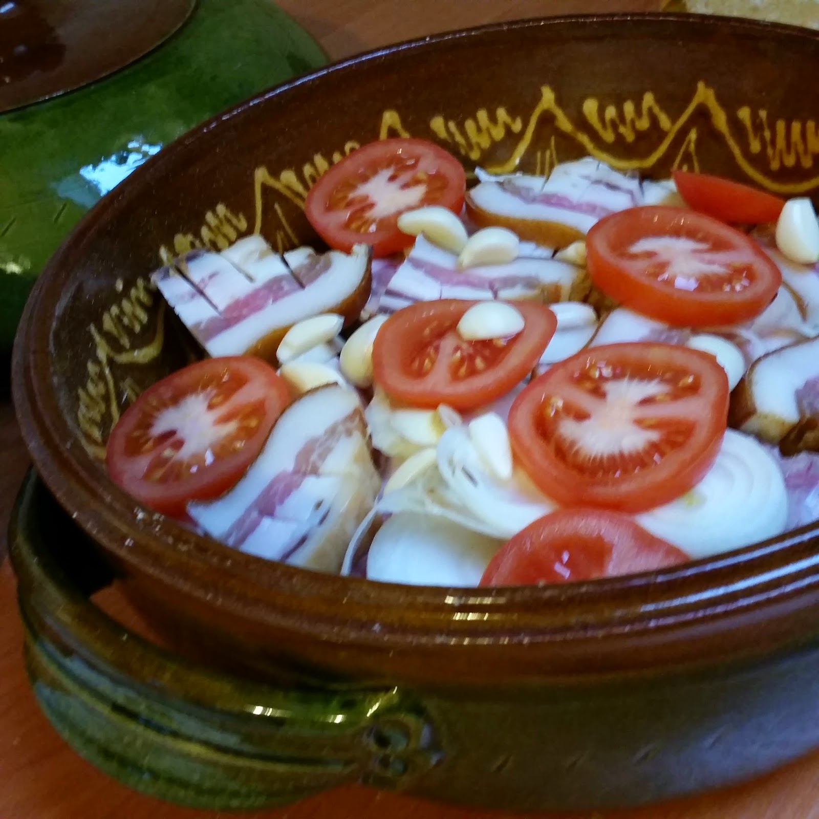 Következett a bevagdalt császárszalonna, a karikára vágott paradicsomok és az egy fej fokhagyma gerezdekre szedve. Az 1 kanál mangalica zsírt elosztottam rajta, s ezzel el is készült a sütésre.