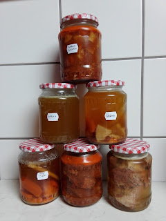 Igen ám, de a pörköltnek kicsit sok lett a leve, s így alakult ki, hogy egy üvegbe sikerült jó sok zöldséggel egy majdani gulyásleves alapot is elrakni.