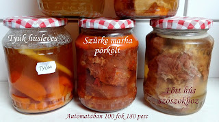 A hőkezelés nagyon egyszerű. A fenti fotókon lehet látni, hogy a kész ételeket üvegekbe rakva, tetejüket jól rácsavarva befőző automatában 100 fokon 180 percig hőkezeltem.