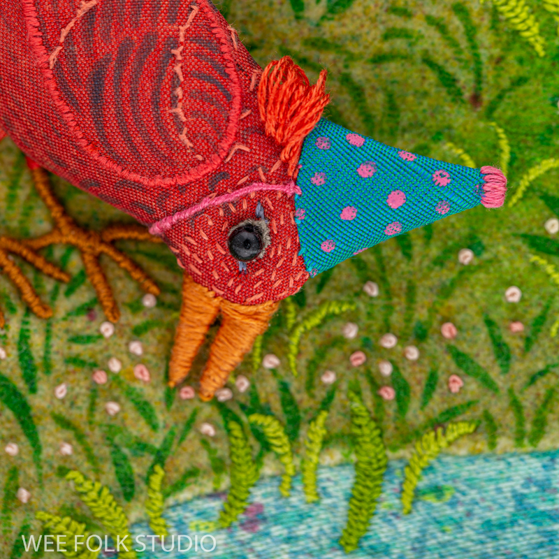 Fascinated by the three-dimensional aspect of stumpwork and its storytelling potential, I was eager to adapt the concept in a way that matched my own artistic style and abilities. Unlike other textile processes with pre-planned designs or grids—essentially functioning as color-by-number projects—stumpwork allowed ample wiggle room to make changes as I worked. This freedom to manipulate and rearrange parts midstream made this method especially appealing to me, as I typically began with a simple sketch and refined my work as I progressed.