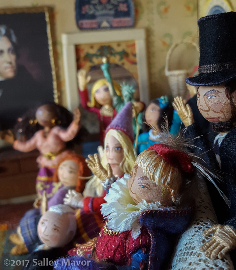 How did the Wee Folk Players come about? The theater troupe evolved naturally in the first days after the presidential election. I did what I always do when distressing events loom large — I occupy my mind with creative thoughts and ideas about what to make and how to do it. Lying sleepless in the dark, I imagined wee folk characters acting out scenarios with pithy captions, like New Yorker cartoons. The unfolding political drama seemed to translate seamlessly into little vignettes with ironic twists. I read the news from a less emotional and more analytical point of view, picking up on the terrifying absurdity of it all. During dinner, I tested out possible parodies and punch lines on my husband Rob, to see if he laughed. Soon, I was making a growing cast of characters with removable heads that fit on a variety of bodies and costumes. For a stage set, I unearthed my old doll house and Rob took photos. Every news cycle presented a surplus of ideas for more episodes in the series. The project took over to the point where I had to postpone starting a new children’s book that has been in the pipeline for a while. In the past 6 months, I’ve published about one installment a week on this blog, which are listed at the end of this post. Our creative partnership continues to evolve and Rob and I are currently working on a stop-motion animated video that includes many of the Wee Folk Players. UPDATE: The film, Liberty and Justice: A Cautionary Tale in the Land of the Free is finished and can be watched on this page.