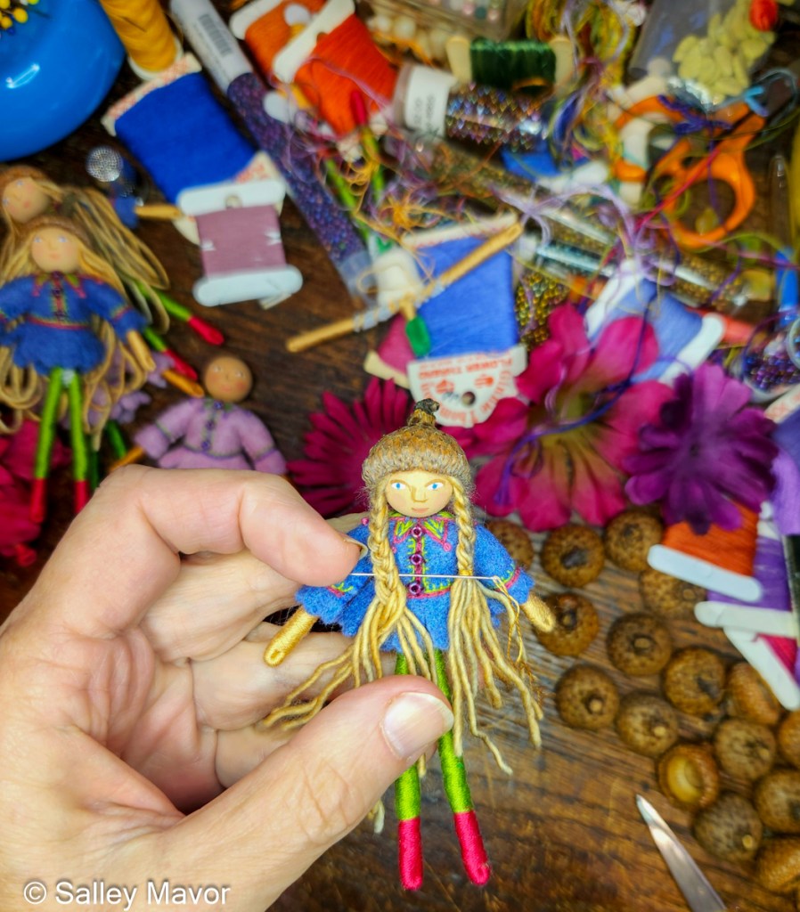 These fairies have a different hair material than I’ve used before. Instead of wool fleece, I used single ply, fingering weight Merino yarn, which is easy to braid. Unfortunately, Flying Finn Yarns, the small cottage industry I bought it from, is not currently in business.