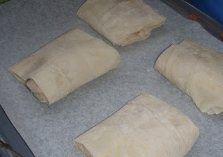 Das Strudelblatt wie eine Frühlingsrolle an den Seiten einschlagen und aufrollen. Mit der Verschlussseite nach unten auf ein mit Backpapier belegtes Blech geben. Auf die gleiche Weise die restlichen beiden Strudelteigblätter und die Füllung verarbeiten.