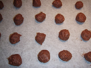 Nun baumnussgrosse Kugeln formen und mit genügend Abstand auf ein Blech legen. 15 Minuten kühlstellen und dann bei 180° ca 10 Minuten backen. Die Kugeln zerlaufen etwas beim backen.