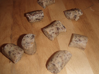 Diese in Stücke schneiden, dann zu Kugeln formen und anschliessend zu kleinen, an den Enden etwas dünneren Würstchen rollen.