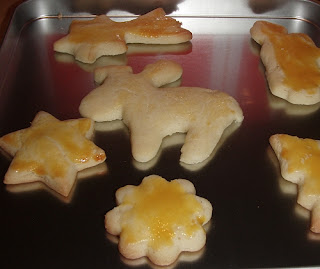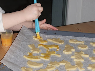Den Teig 4mm dick auswallen und mit verschiedenen Förmchen ausstechen und auf ein Blech mit Bachpapier legen, Mit Eigelb bepinseln und ca 20 Minuten kalt stellen. Bei 200° ca 8 Minuten backen.