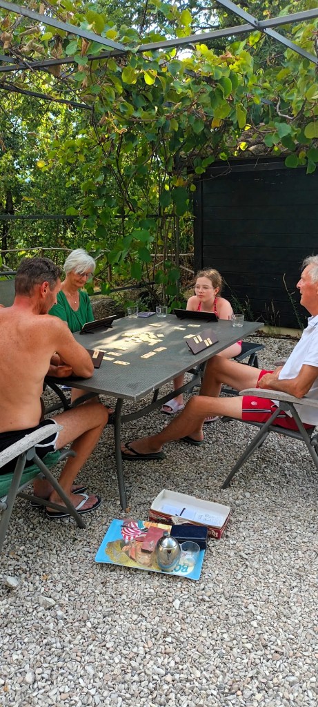 We beginnen de dag bij een graad of acht maar rond tien uur is de temperatuur verdubbeld. Zo heb ik het graag. Als ik na het ontbijt weer boven kom om mijn tanden te poetsen is de zon zover gedraaid dat ie zijn stralen in de badkamer drapeert. Vermeer liet het licht van links komen bij het meisje en nu wordt ze van twee kanten beschenen. Willen jullie even meeduimen dat de logees die woensdag hier aankomen, ook nog wat zonneschijn te zien krijgen? Ze noemen hun korte vakantie namelijk Nazomeren en dat doe je het best zonder druilweer.