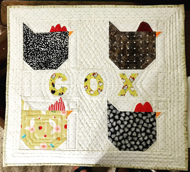 | I have been busy with wallets, key fobs and busy bags and it was time for a change of pace. I have several quilts that I could be working on but.... last weekend I had the family over for dinner and my granddaughter-in-law who I thought didn’t like quilts very much was admiring my wall hangings (courtesy mostly of SewCanShe). She decorates in roosters, and she and my grandson have what they call their “C” wall. This isn’t roosters, but it is poultry, and their “C wall is after their last name , so I hoped they’d like this. She saw it on Instagram, and they do I’m delivering it this morning. I believe I saw this first on SewCanShe, which referred to Quilty LoveQuilty Love and then to the chicken tutorial at Sew Inspired.Sew Inspired. |