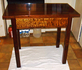 I wanted to share some more of my brothers tables. A few months ago he made me a laptop desk very similar to these, and I guess he liked it too because he has made himself these two. The darker one is walnut and he made it first for a laptop table for himself, and then he made the second from cherry and just finished it in the past few days. He wanted it to hold an old singer sewing machine that he had gotten for himself and uses occasionally, although he is not a quilter. The legs were a little short so he added some ebony wood and it looked nice so he also made an ebony knob and added some little round insets on each side that he made from oak and dyed ebony. Between the three of them, they are similar but a little different from each other and I love all 3. I'm really proud of his skill, he just started a few years ago and is self taught and does really beautiful work. He does almost everything himself except cut down the tree, when he starts it is a big heavy rough board and he goes from there. I think he is quite something.