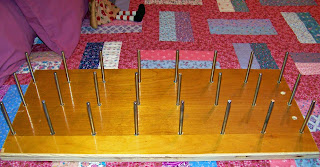 The thread stand he and my other brother made for me. I had only requested a scrap of lumber with some nails, but they nicened it up for me with my brothers woodworking tools. The metal dowels were rods that he cut and then smoothed with a grinder. The only mishap, was my younger brother nicked a piece of his little finger on one of the tools.