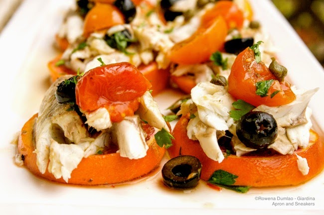 When I cook fish, my hands move faster than my brain. I automatically grab a handful of cherry tomatoes, a pack of olives, a bottle of capers, a bunch of parsley, a bottle of extra virgin olive oil & white wine. These ingredients have permanency in my kitchen. They go very well together so the aspect of thinking is not a requisite.