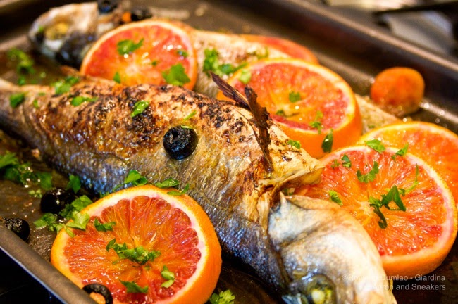 Back to the fish. It's still orange season and I have some beautiful Sicilian blood oranges in the fruit bowl so I cut up a couple and put them in the baking pan too. This is the first time I cooked fish with oranges and won't be the last because the combination came out agreeably well.