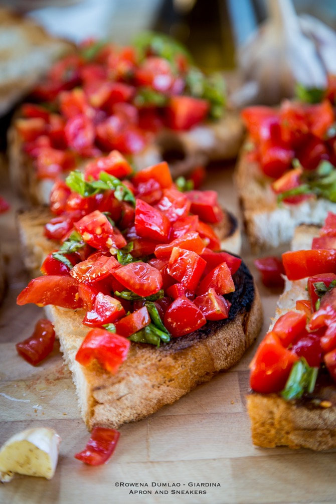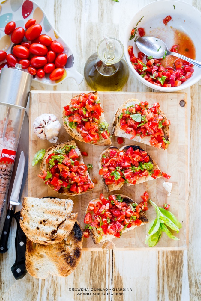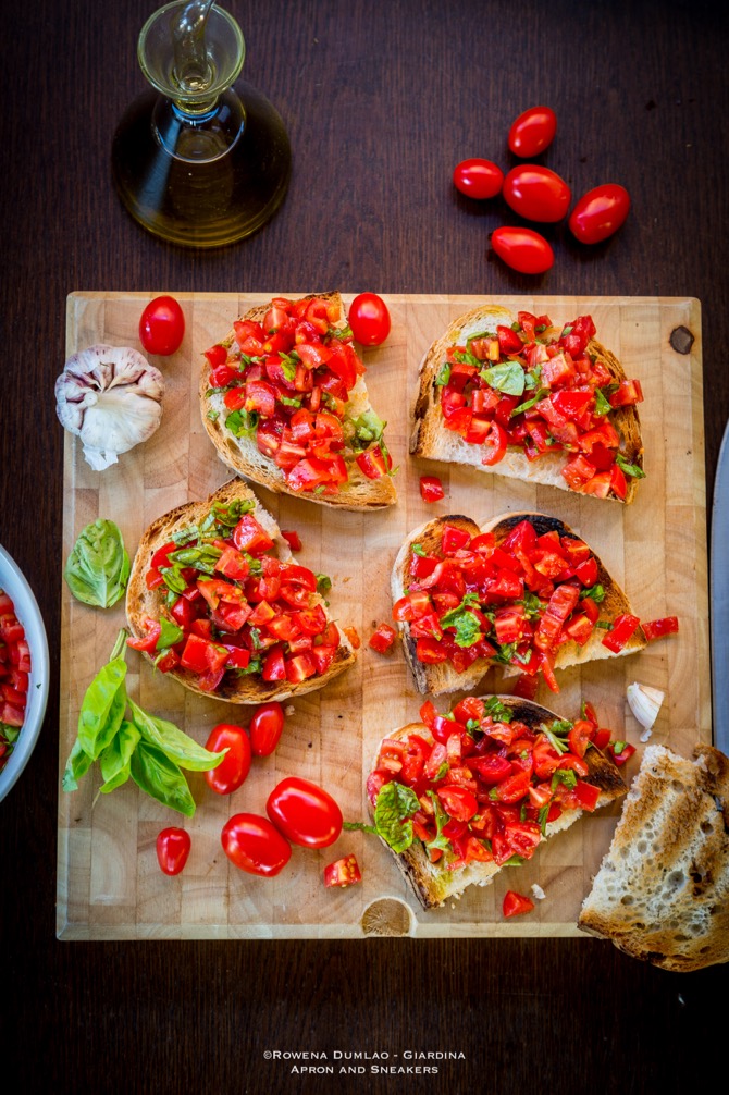 Like with the good oil, use the best tomatoes you can find. After all, the tomatoes & oil are the protagonists of this dish. I like using cherry or grape tomatoes because they are the tastiest especially the pacchino, datterini or vesuviano. Chop them as finely as you can so that they won't fall off so much from the bread while you're eating them. I am usually in a hurry so I don't get to chop them as small as I would want to.