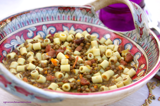 I usually cook the lentils the classic way with the usual vegetables but when I add the pancetta affumicata and speck, it becomes spectacularly delectable. The two kinds of ham together work their wonders in making this dish very good. Jazzing up boring dishes with savory characters just has to happen sometimes. If you are vegetarian and would like the dish to be traditional, just take away the cured meat part and you will still enjoy this lentil and pasta soup.
