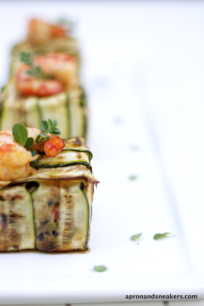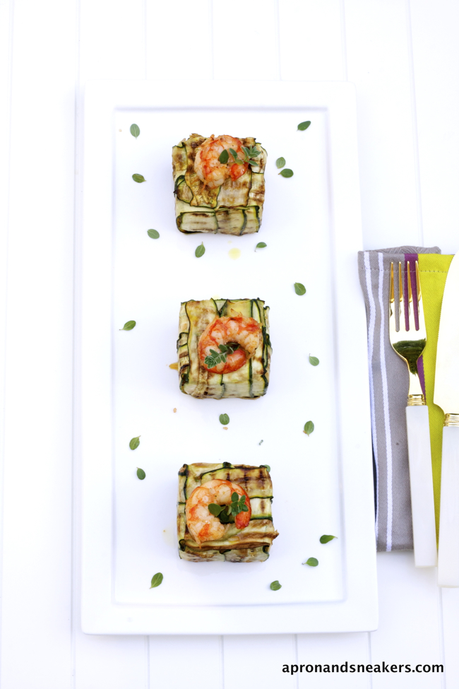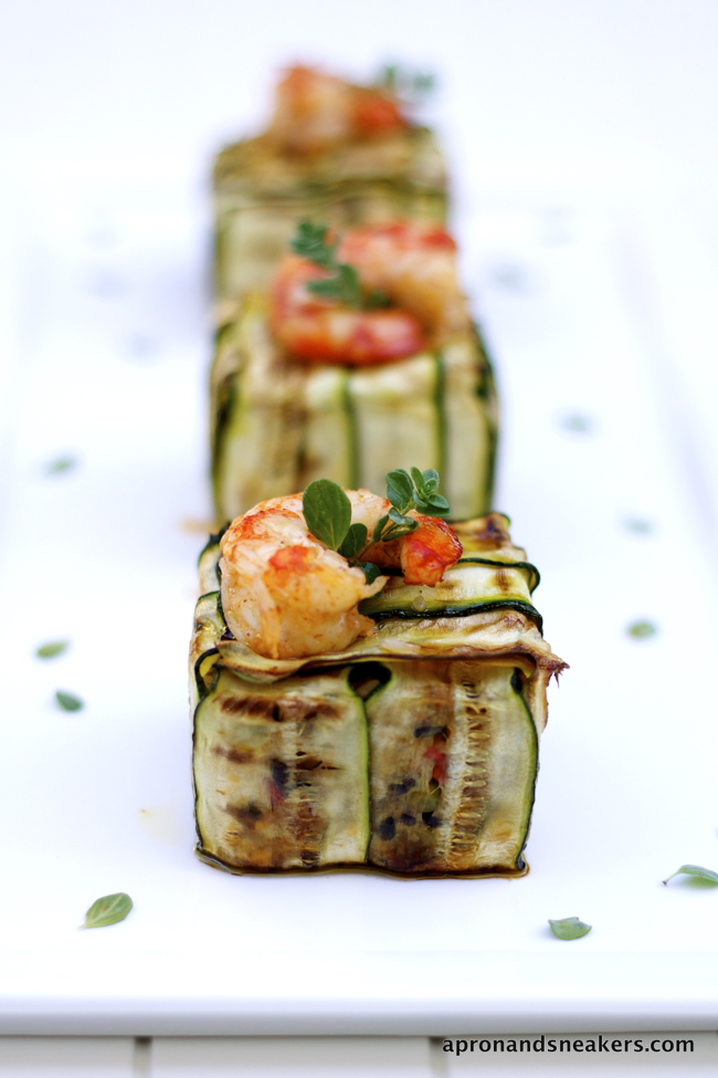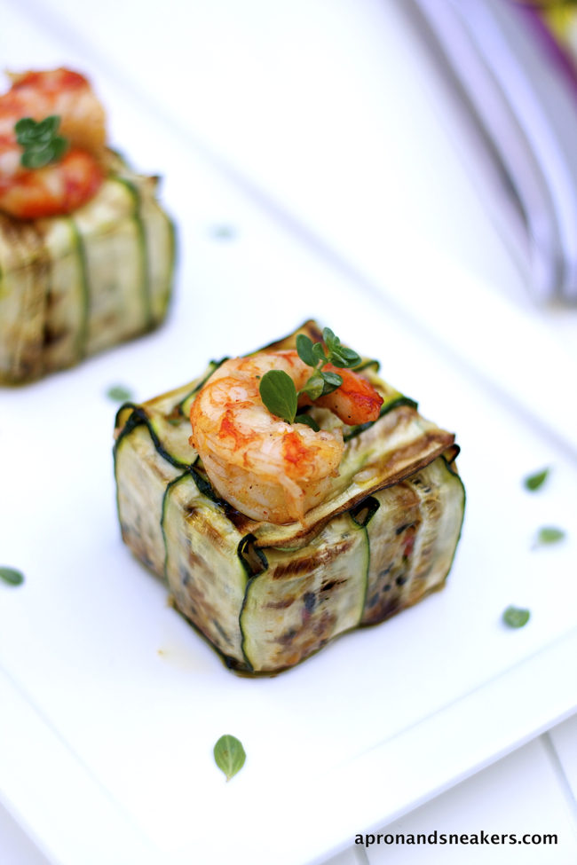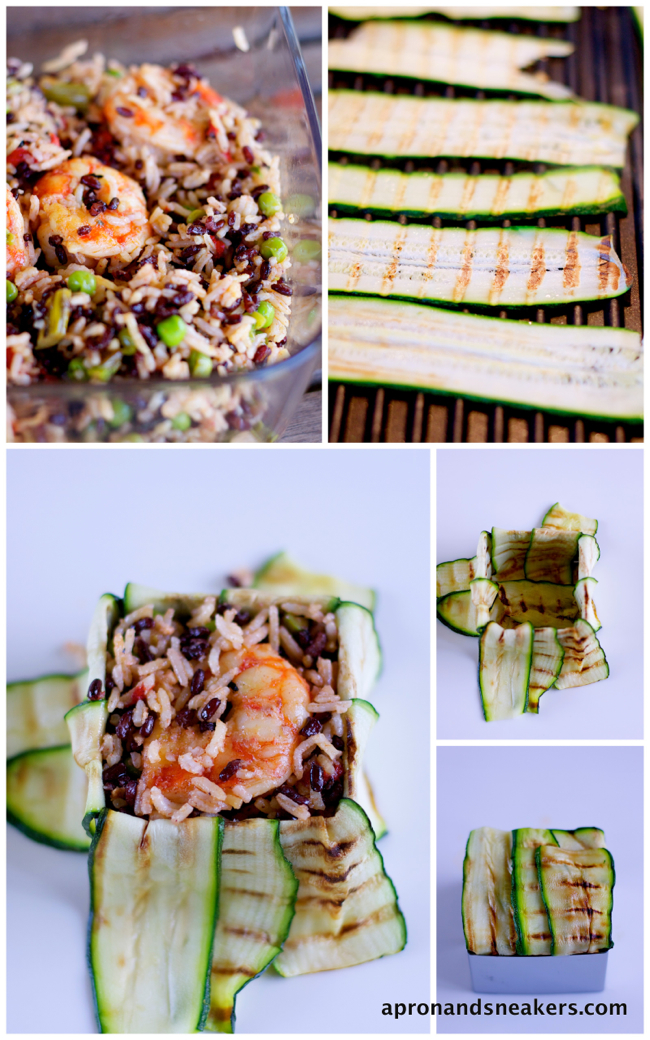 - Fill up with the rice mixture. Close with the zucchini slices hanging outside the mold. Top with a shrimp.