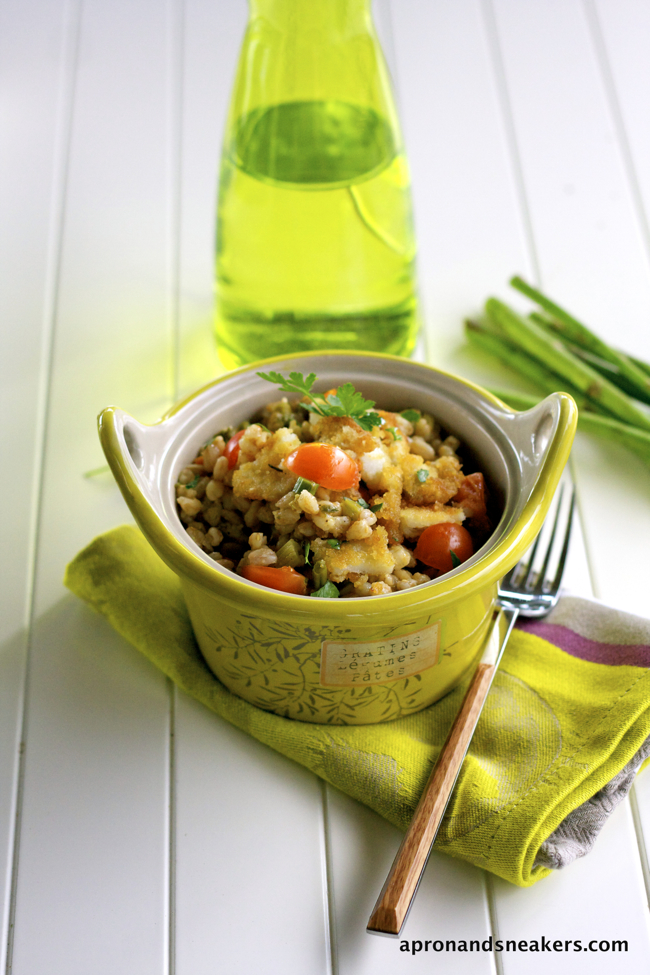 This farrotto is my first step in eradicating some fresh ingredients hiding in the vegetable bin. Half asparagus bundle - gone. Cherry tomatoes - will never be gone (Sigh!). Fish - totally gone. Farro - finally finished. Celery - saved from the bin. And that is one satisfying work concluded.